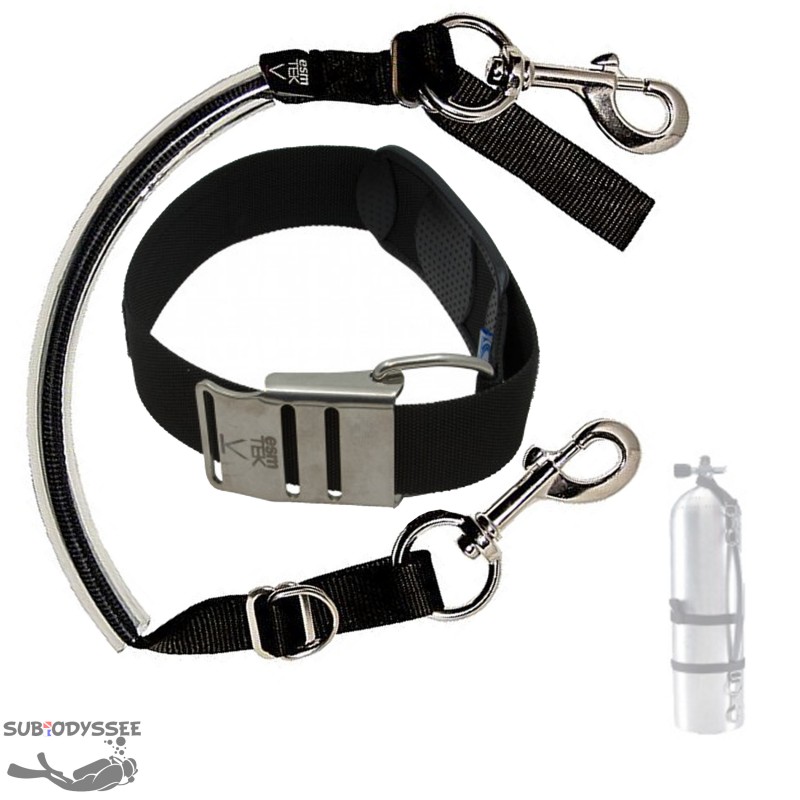 - 1 Poignée renforcée en tube PVC pour un portage confortable - 2 mousquetons laiton pour fixation au gilet stabilisateur - 1 Sangle cinch réglable (Pour s'adapter aux différents volume des bouteilles) - 1 Boucle cinch band en METAL.