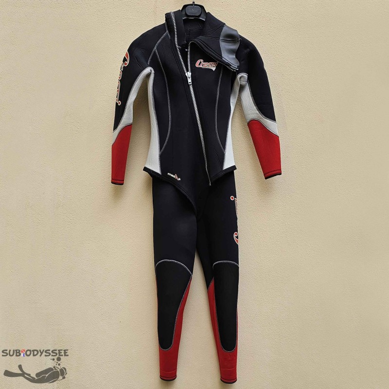 - Coupe très anatomique, avec les jambes & les bras préformés (le confort qui en résulte durant la plongée est très élevé vu qu’au cours du palmage les membres se trouvent en position réellement naturelle).