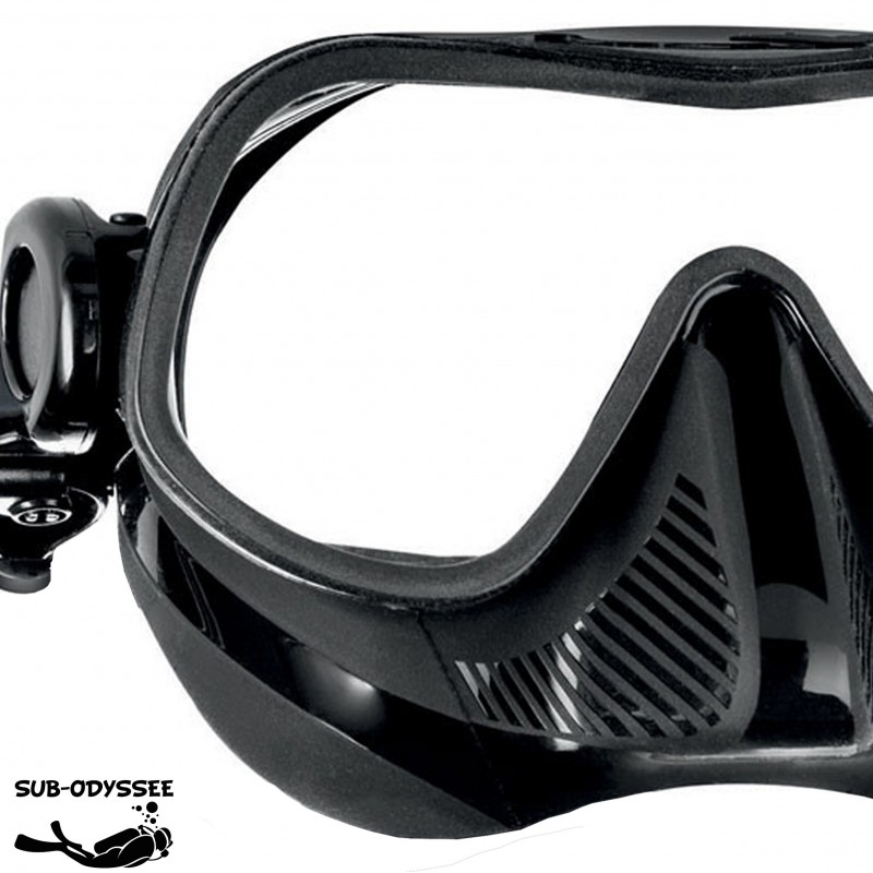 - Le masque mono-verre à très faible volume interne (offre une vision panoramique du monde sous-marin).