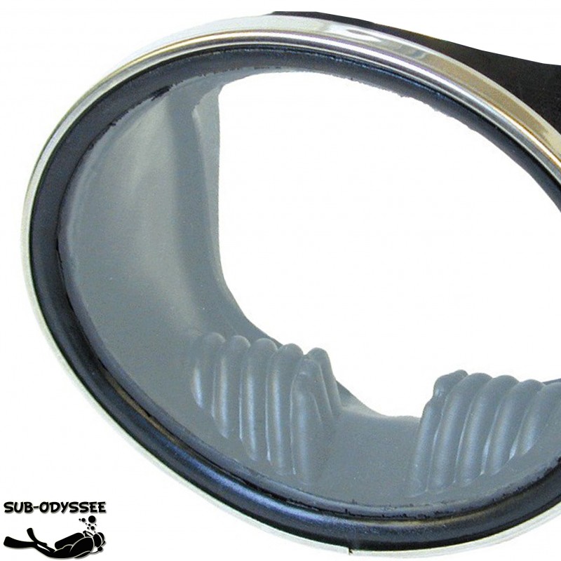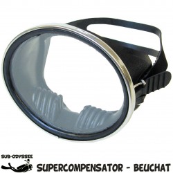 - Masque rond en caoutchouc avec bossages de compensation (emplacement pour pincer le nez afin d'équilibrer les oreilles facilement) & cerclage inox.