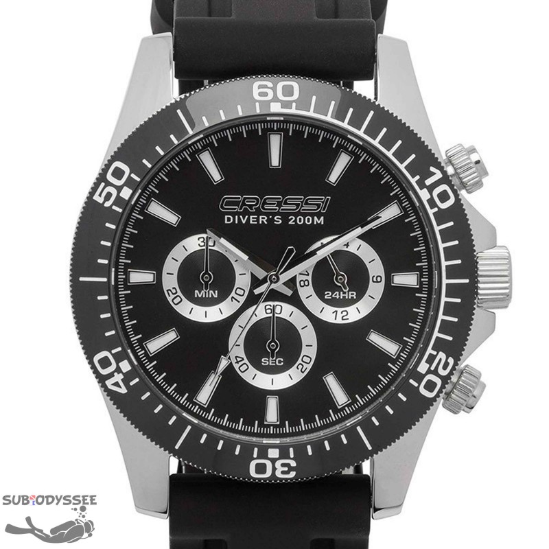 La Cressi NEREUS est une montre de plongée analogique, étanche à 200m de profondeur avec boîtier en acier inoxydable, verre en cristal & bracelet en silicone.