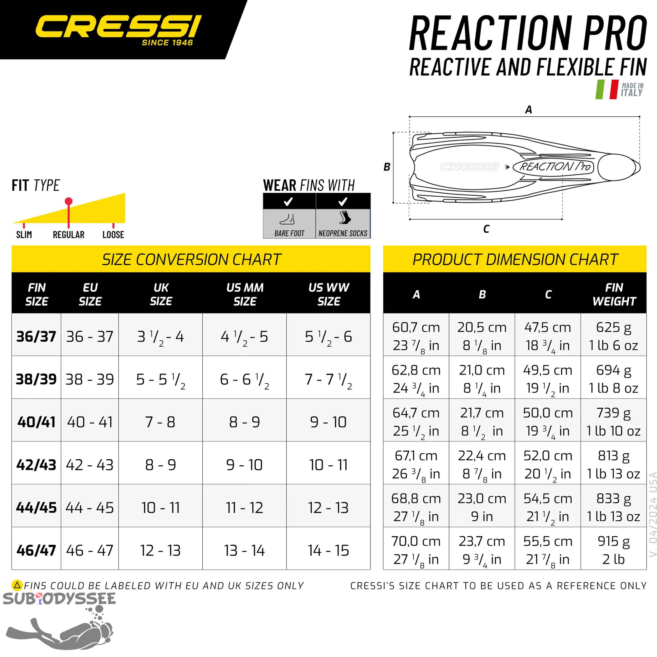 - Structure moulée en 3 matériaux : Grâce au système exclusif et breveté Cressi, la REACTION PRO offre un palmage étonnamment fluide, puissant et nerveux. La voilure possède une épaisseur différenciée, plus importante devant le chausson et diminuant vers l'extrémité de la palme.