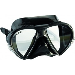 Les verres se trouvent dans la position la plus proche possible de l'œil, pour améliorer & augmenter le champ visuel, le portant ainsi au maximum des possibilités. Le cerclage, avec son nouveau design, est si fin qu'il devient totalement invisible dés que le masque est porté. Dans la partie supérieure se trouvent des inserts en matière souple qui lui confèrent un très bon "grip" & une esthétique remarquable. La jupe en silicone souple a un nouveau profil & une large lèvre d'appui pour une étanchéité excellente & un confort sans précédent. Le volume interne de ce masque est extrêmement réduit. Il est inférieur à celui de beaucoup de modèles pour l'apnée.
