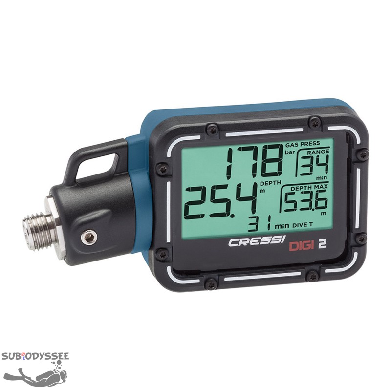 Avec DIGI 2, Cressi propose un instrument de haute précision qui fournit les indications de pression de l'air, mais aussi d'autres données d'intérêt constant pour le plongeur.