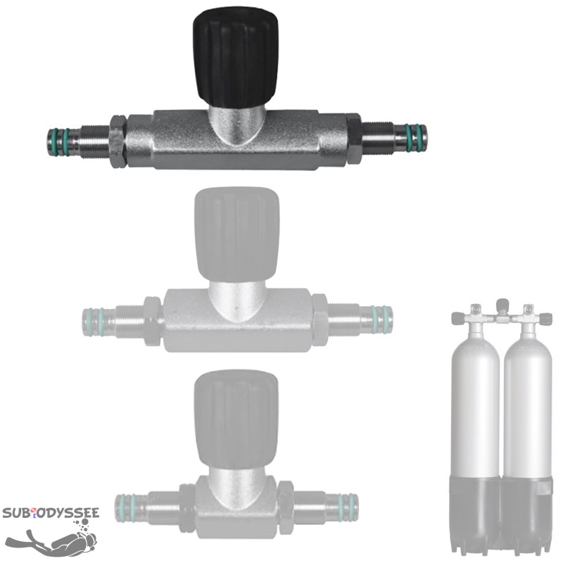 Barre centrale de liaison avec robinet central d'isolation pour bi-bouteilles de plongée Ø 204 mm : - 2 x 12 Litres Court - 2 x 13.5 Litres - 2 x 15 Litres - 2 x 18 Litres.